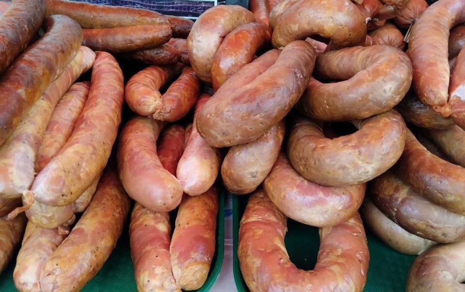 На прилавках ярмарки были представлены свежие и натуральные товары, среди которых: выпечка, разнообразные виды колбас, а также свежие овощи и фрукты.