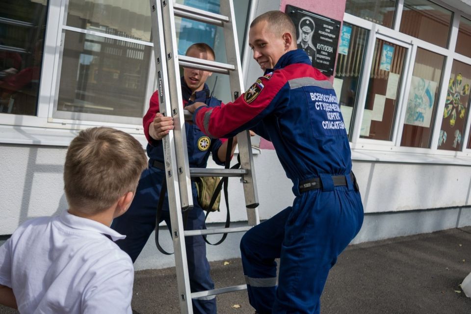 Завершилось мероприятие учебной эвакуацией. В ходе тренировки один из классов был условно заблокирован, и его ученики под присмотром добровольцев покинули здание через окно с применением специальной лестницы.