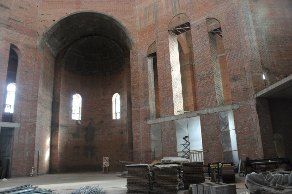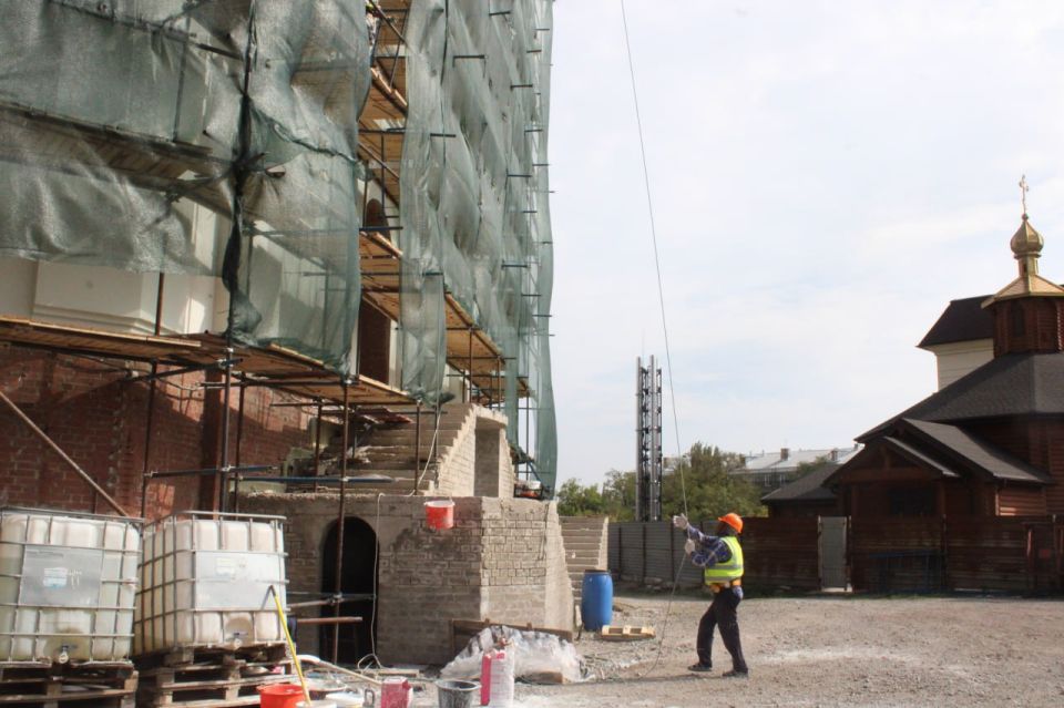 Производится замена окон, изготавливаются арочные конструкции на производстве. Следующий этап – облицовка цоколя гранитом, а также устройство фундамента и железобетонных конструкций для лестницы центральной паперти – площадки перед входными дверями храма». Строители залили бетоном площадку под установку главной входной группы.
