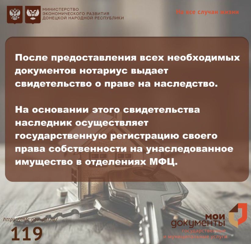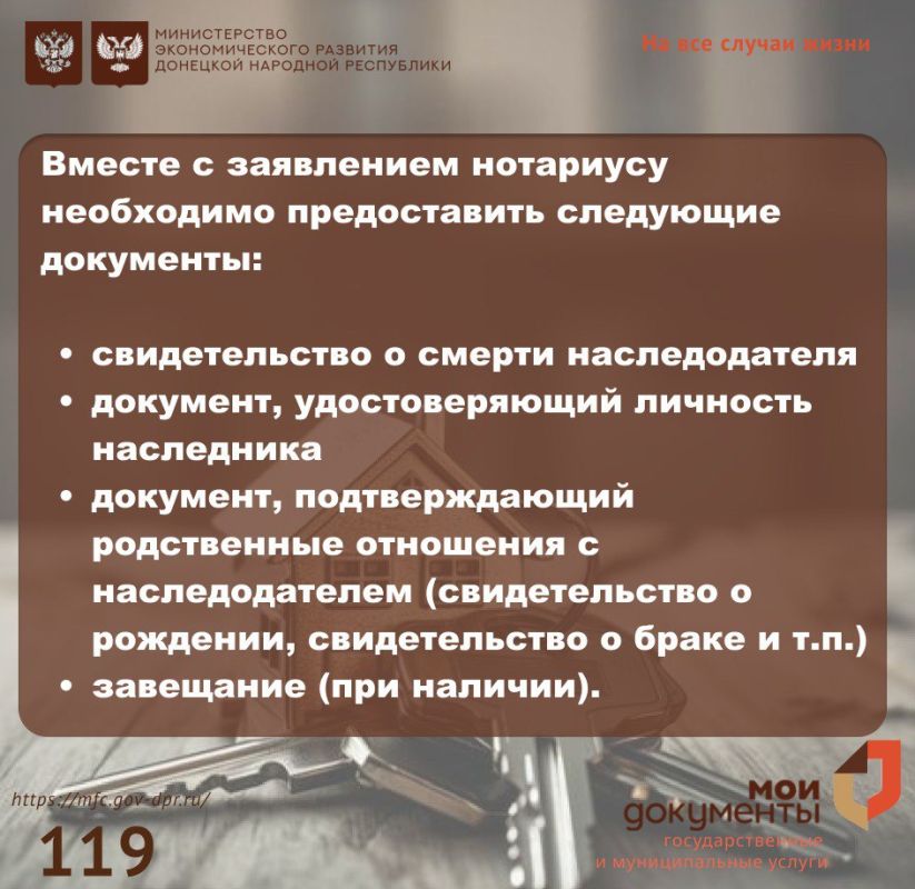 Если необходимые сведения об имуществе, которое входит в наследственную массу, отсутствуют в базе ЕГРН, МФЦ ДНР поможет внести недостающую информацию. Для этого вам понадобятся следующие документы: