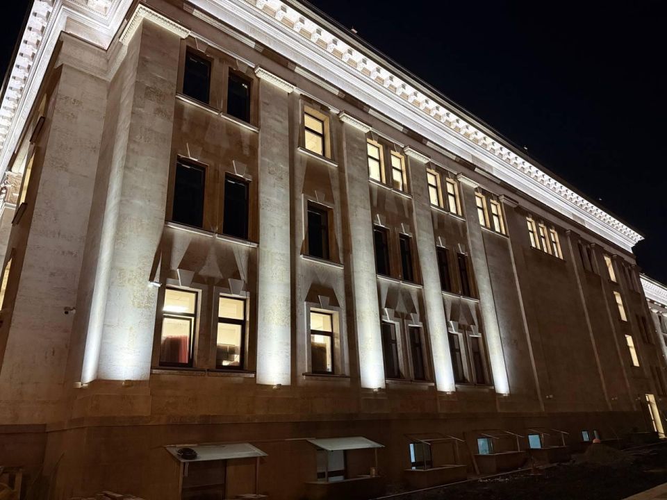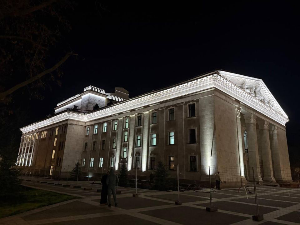 Строители Санкт-Петербурга проводят пусконаладочные работы архитектурной подсветки фасада здания драмтеатра