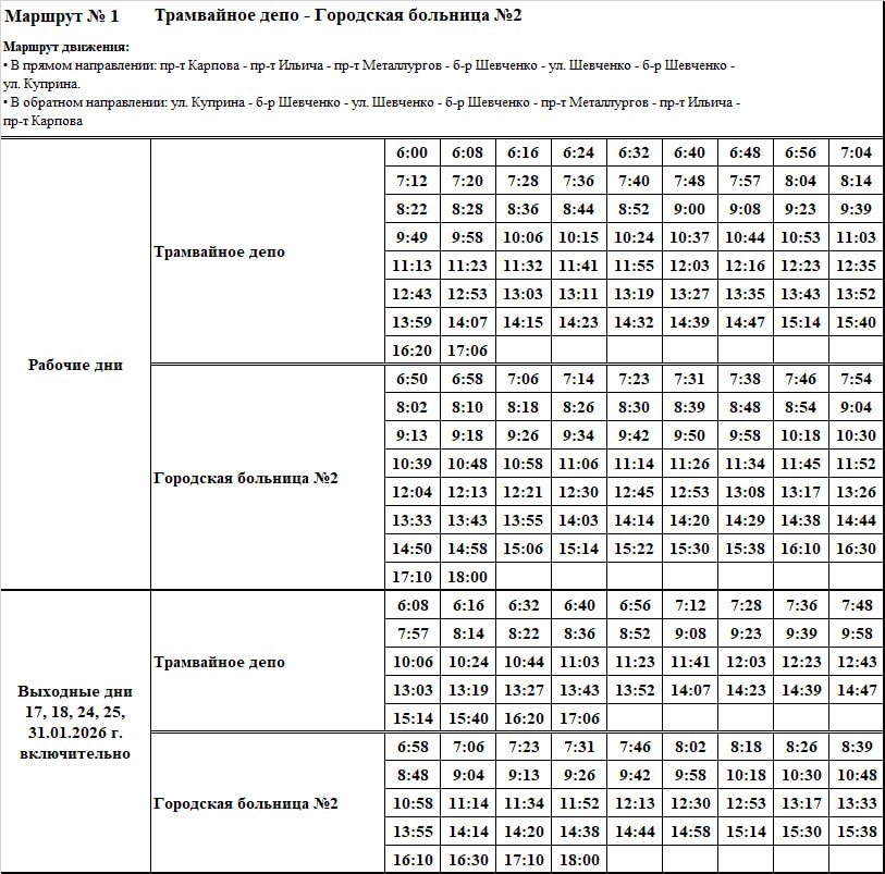 С 17.01.2026 г. изменяется расписание выходных дней (17, 18, 24, 25, 31.01.2026 г. включительно) трамвайного маршрута №1 «Трамвайное депо - Городская больница №2».