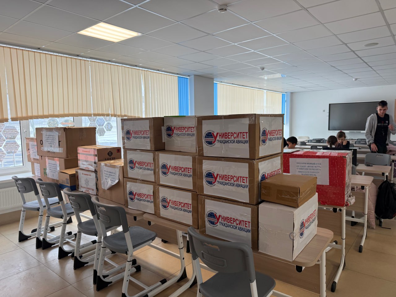 На этот раз подарки были доставлены в Невскую школу и школу №7 города Мариуполя. Ребятам были отправлены сладости, канцелярия и приятные сувениры.