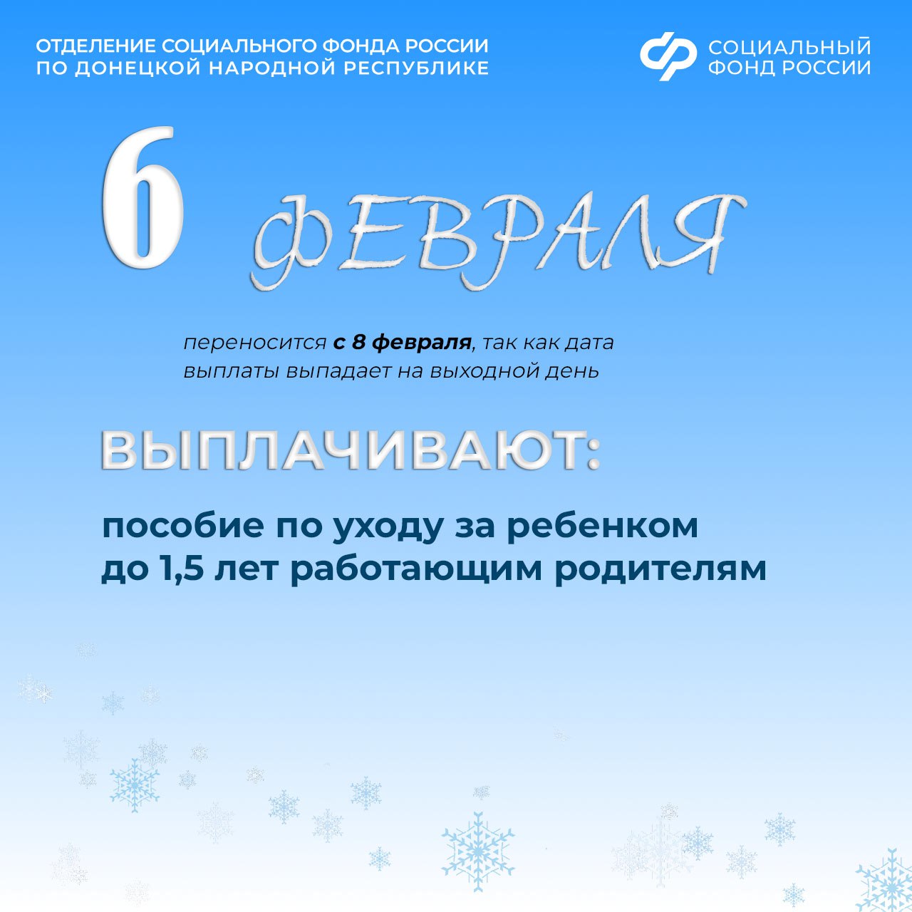 Пособие по уходу за ребенком до 1,5 лет работающим родителям поступит досрочно, 6 февраля, т.к. единая дата зачисления этой выплаты — 8 число — приходится в феврале на выходной день.