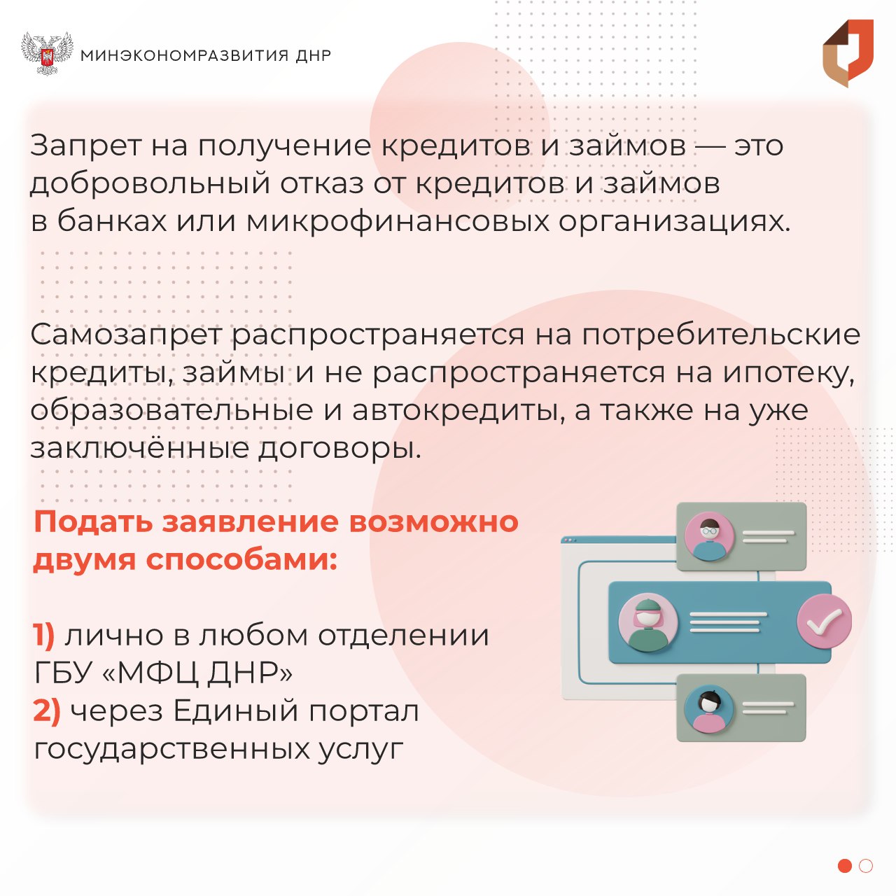 Снять самозапрет на выдачу кредитов можно на портале «Госуслуги» при наличии усиленной квалифицированной электронной подписи (УКЭП) или обратившись в отделение ГБУ «МФЦ ДНР».