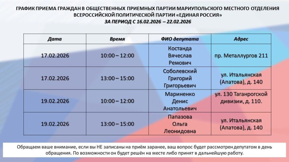 График приёмов депутатов Мариупольского городского совета с 1 6 по 22февраля
