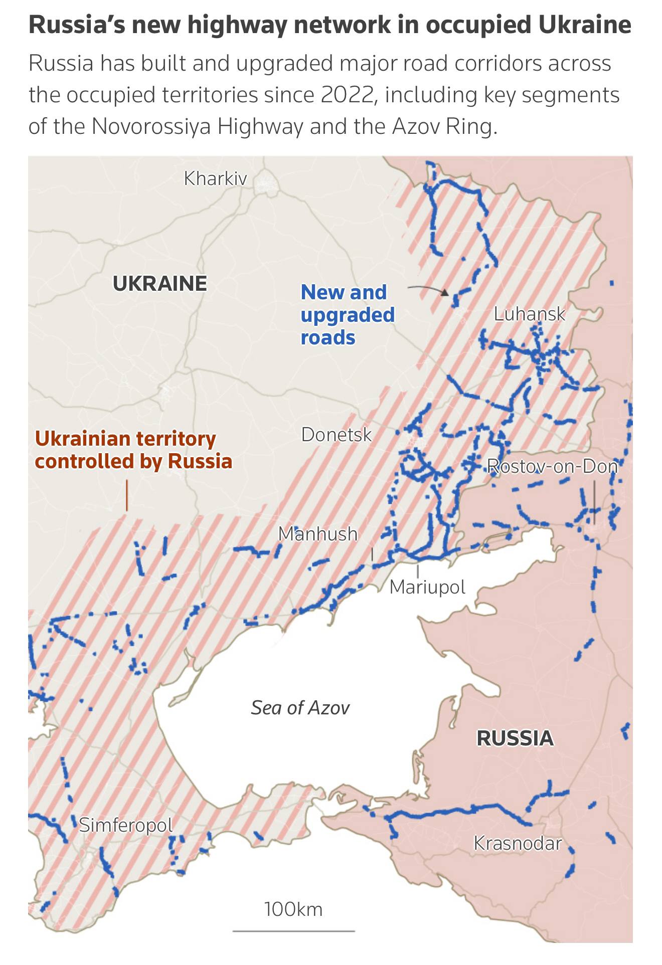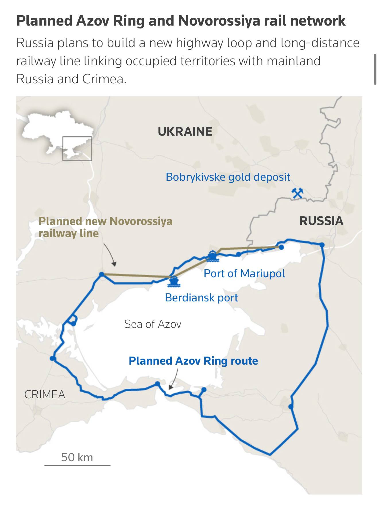 Ключевой проект — «Азовское кольцо», который очень пугает авторов, — мощная транспортная артерия протяжённостью 1400 км, которая свяжет новые регионы с Крымом и материковой Россией.