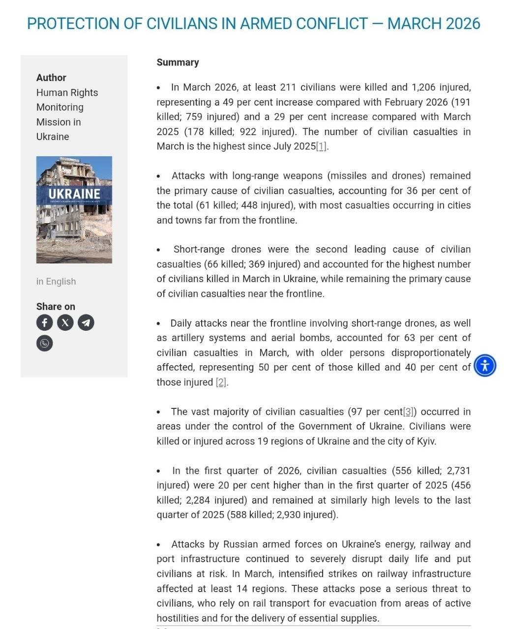 ООН зафиксировала значительный рост числа жертв среди гражданского населения в Украине: в марте это число выросло на 49%.