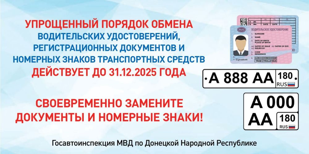 Срок замены водительских удостоверений, документов и номерных знаков образца ДНР или Украины истекает 1 января 2026 года