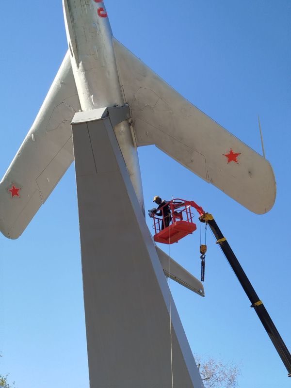 Памятный знак "Самолёт" на пр. Ленина обновляют ко Дню Победы