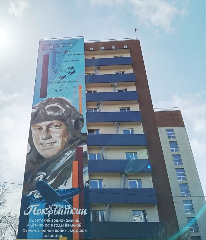 В центре – крупным планом портрет Александра Покрышкина. Слева – картина воздушного боя над Большим Токмаком Запорожской области. А известен этот бой 29 апреля 1943 года тем, что восьмёрка ведомых Покрышкиным «Аэрокобр» рассеяла и повернула назад три эшелона немецких штурмовиков - 81 самолёт под прикрытием десяти «Мессершмиттов».