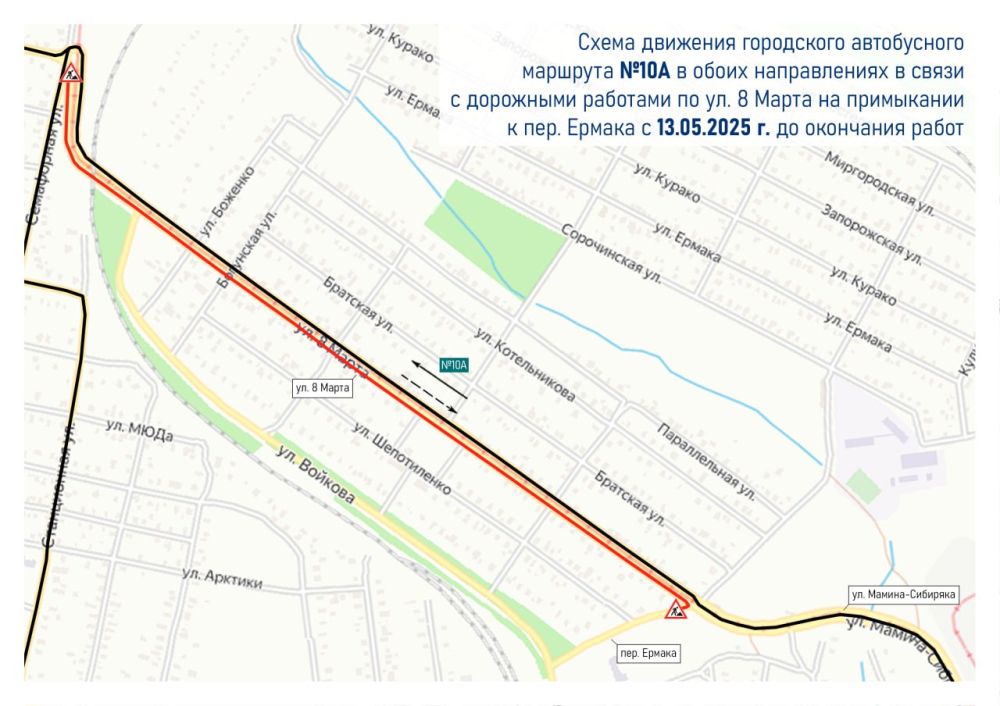 В связи с дорожными работами по ул. 8 Марта на примыкании к пер. Ермака, городской автобусный маршрут №10А «ТЦ «ПортСити» – пос. Мирный» (движение по ул. Калиновского) изменяет схему движения в обоих направлениях: