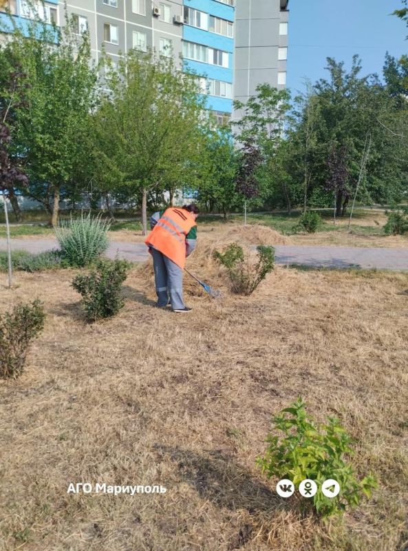 По улице Киевской рабочие зеленого строительства производят покос травы, а в парке «Родина» - выгребание ранее скошенной растительности.