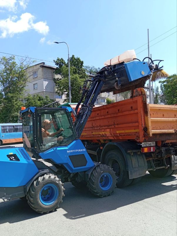 Так, сегодня с помощью мини-погрузчика «Митракс» дорожники убирают проезжую часть по улице Апатова – тщательно очищают подбордюрную зону от пыли и мелкого мусора.