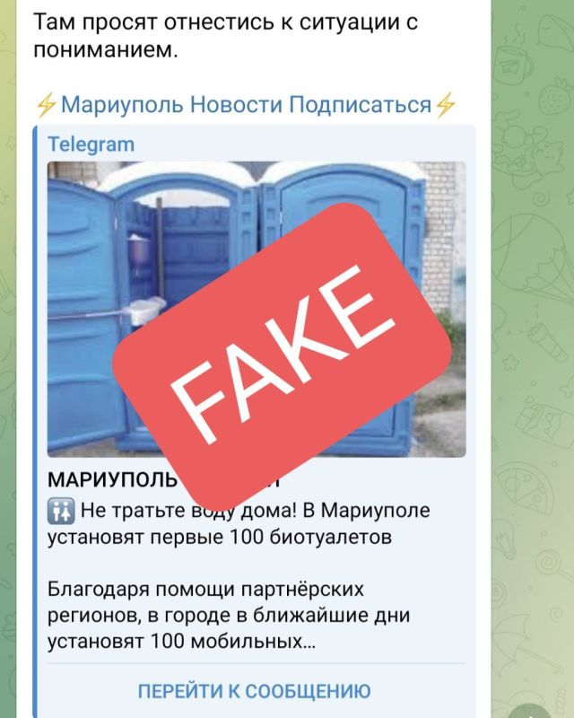 Администрация городского округа Мариуполь опровергает распространяющуюся в соцсетях информацию о массовой установке в жилых кварталах платных биотуалетов. Просим жителей критически относиться к публикациям из сомнительных источников и не принимать их на веру: