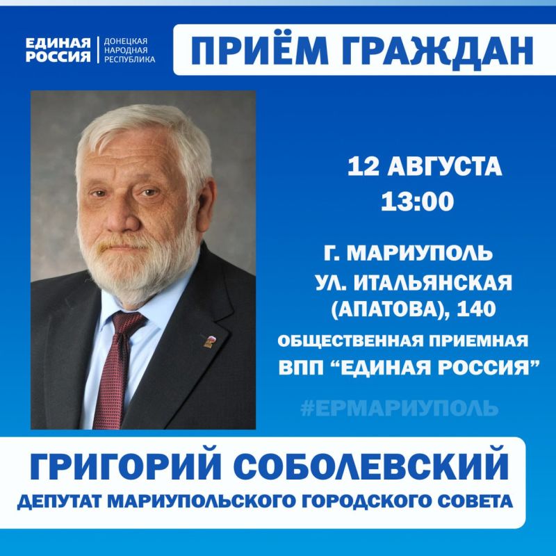 С 5 августа по 15 августа в 10:00 и 13:00, состоятся приёмы депутатов Мариупольского городского совета: