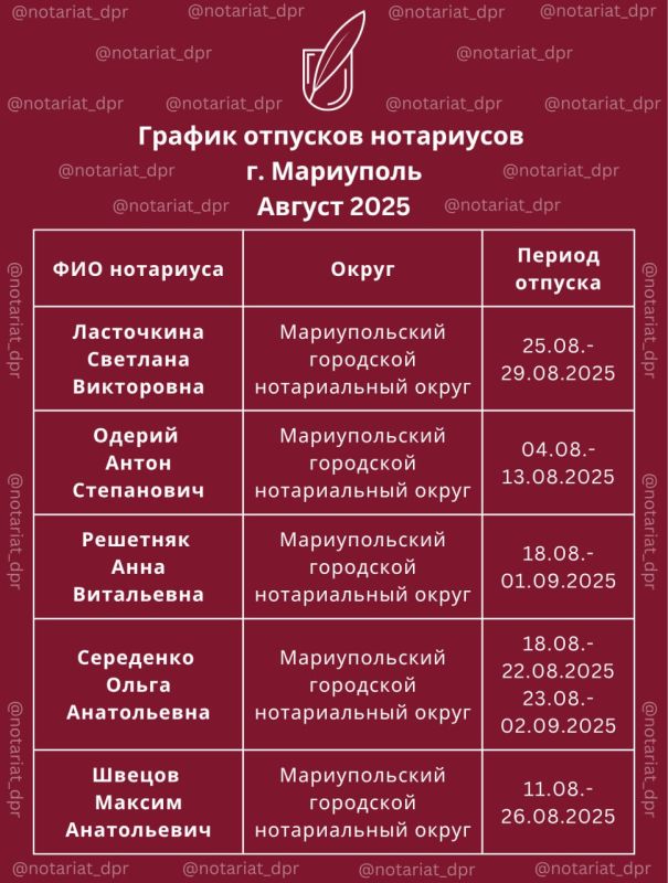 Информируем вас о графике отпусков нотариусов города в августе.