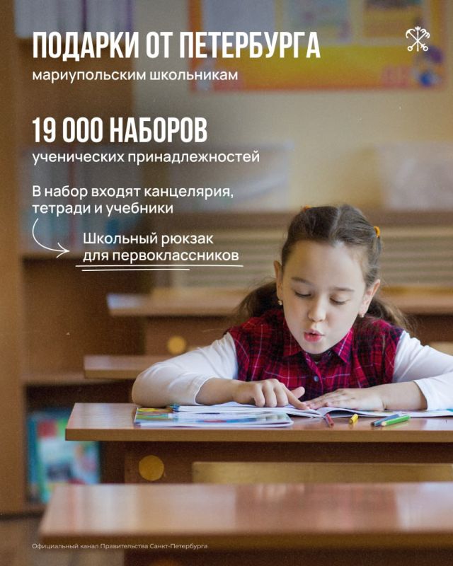 Из Северной столицы в город-побратим отправятся 19 000 наборов для учащихся. Вместе с канцелярией и учебниками в мариупольские школы и детские сады отправились мебель, игрушки и современное лабораторное оборудование.
