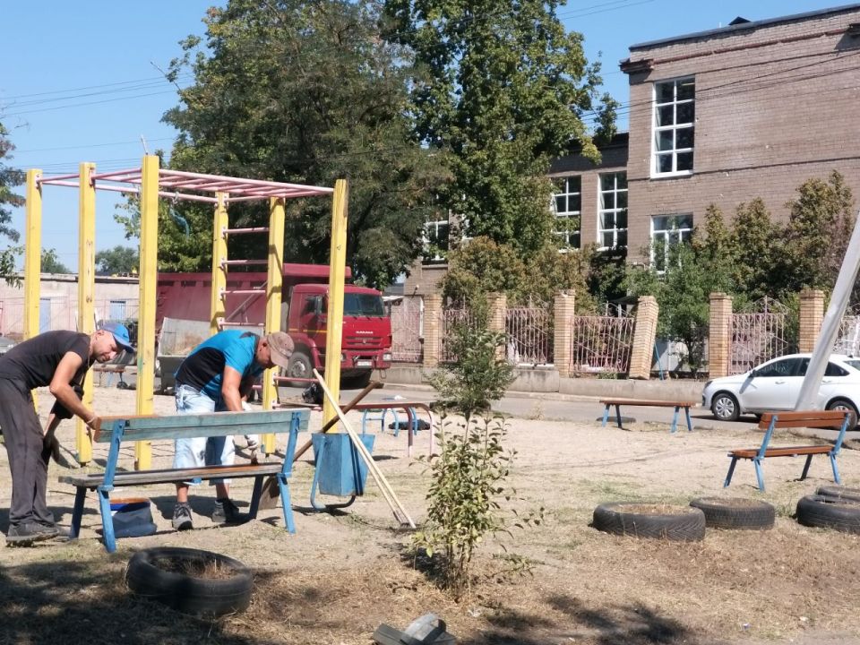 ремонт и окрашивание лавочек, а также элементов детской площадки;