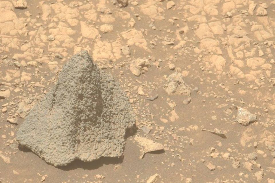Марсоход Perseverance обнаружил на поверхности Марса камень необычной формы, который пользователи в сети сравнили то со старинной шляпой, то со средневековым шлемом. Снимок был сделан 5 августа 2025 года!