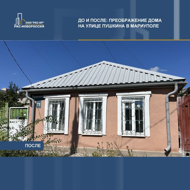 Шифер на крыше заменили на профнастил с установкой ливнёвки, отмостку отремонтировали, вставили новые окна и входную дверь, сделали фасад.