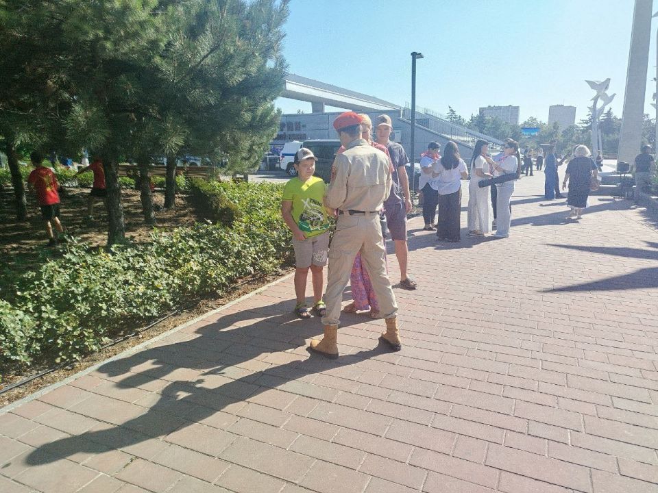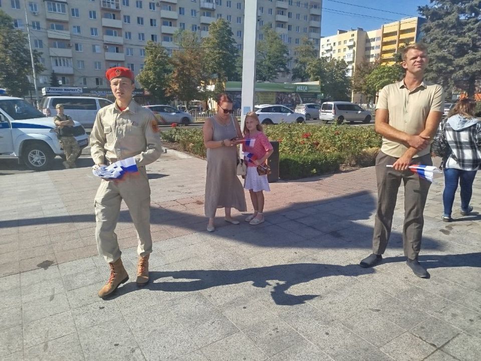 Юнармейцы г.о. Мариуполь приняли участие в акции #ДеньФлагаРФМГЮ жителям города были розданы ленточки и рассказана история создания флага РФ.