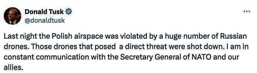Премьер Польши Туск официально заявил, что на польскую территорию залетели российские дроны