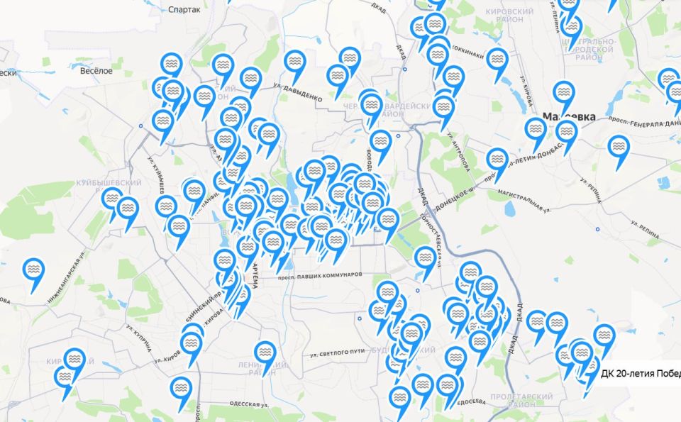 Карта разлива воды в Донецке и пригородах обновляется ежедневно. Здесь собраны данные обо всех официальных точках. Адреса на карте сформированы по спискам, публикуемым городскими администрациями.