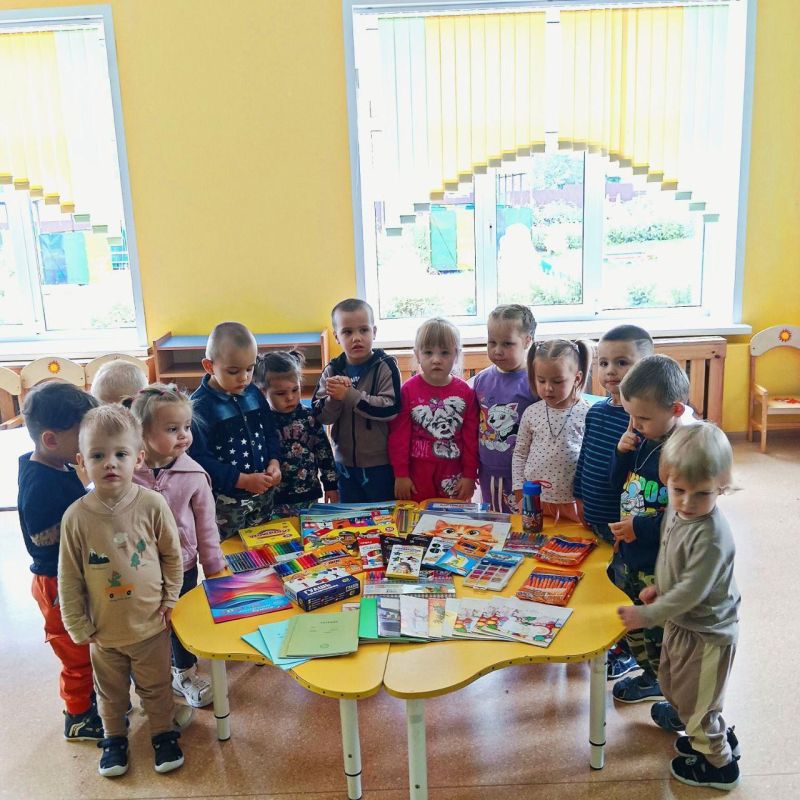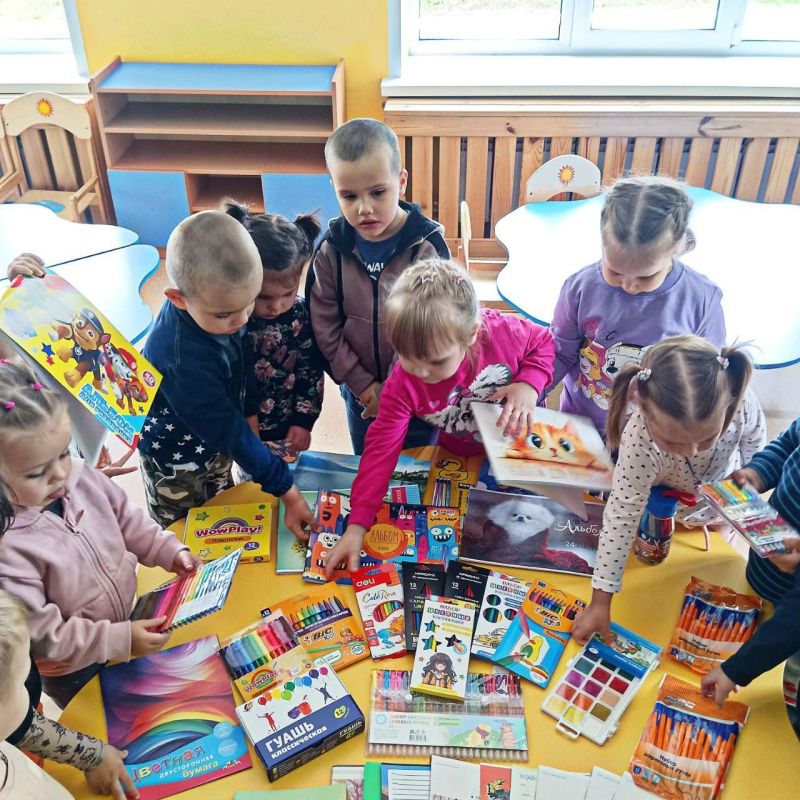 А воспитатели и воспитанники средней, 2-й младшей и младшей групп детского сада №1 города Щекино собрали для мариупольского детсада №160 «Родничок» канцелярские принадлежности.