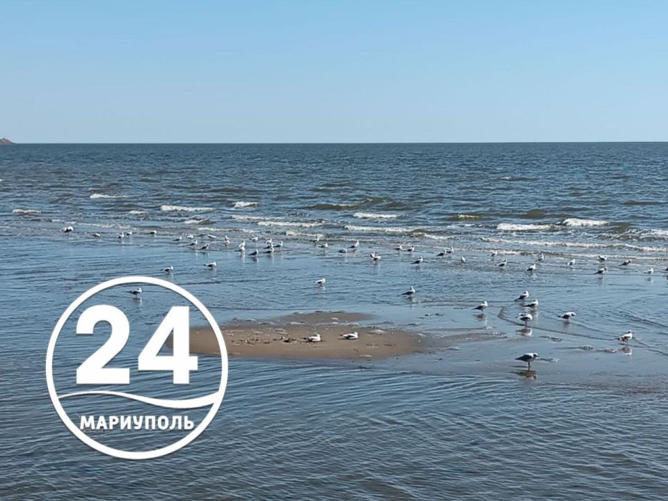 Море рядом с пирсом настолько обмелело, что местами проступает дно и образуются островки. Чем воспользовались чайки.