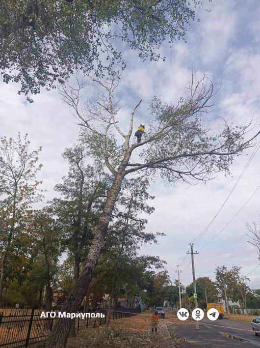На территории, прилегающей к левобережному парку «Веселка», под руководством сертифицированного специалиста, профессионала в области древесной экспертизы и выявления аварийных деревьев, а также мастера спорта по альпинизму мариупольские коммунальщики выполнили обрезку аварийно-опасных ветвей деревьев над линиями электропередачи.