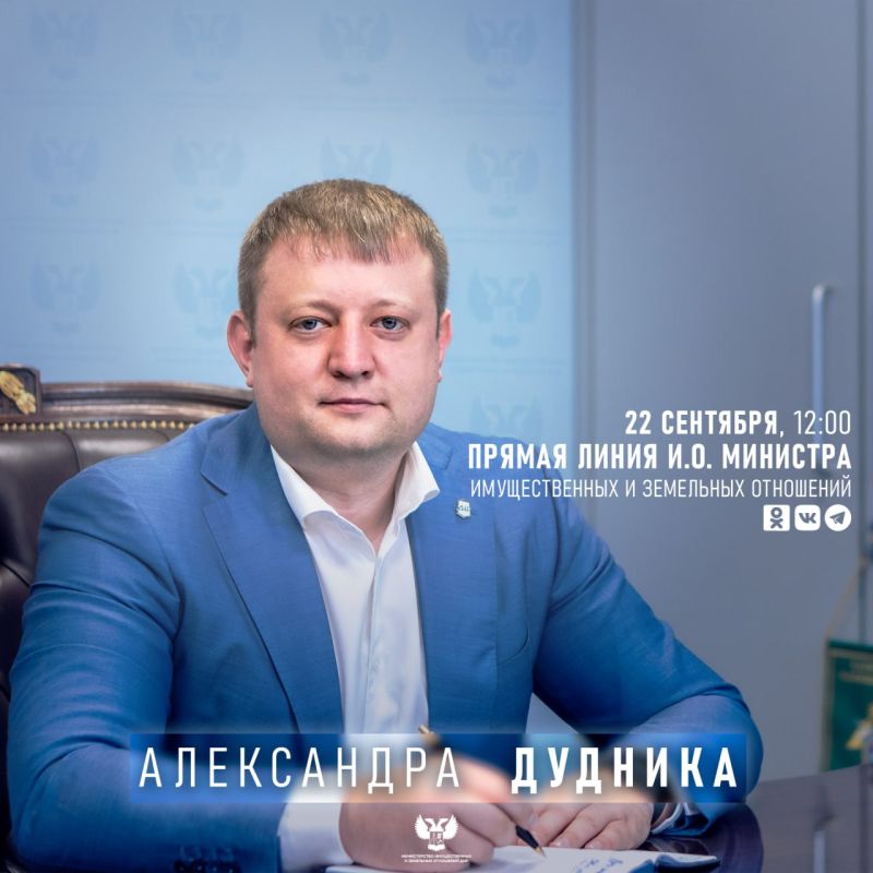 По поручению Главы ДНР в понедельник, 22 сентября, в 12:00 состоится прямая линия и.о. Министра имущественных и земельных отношений ДНР ДУДНИКА Александра Сергеевича.