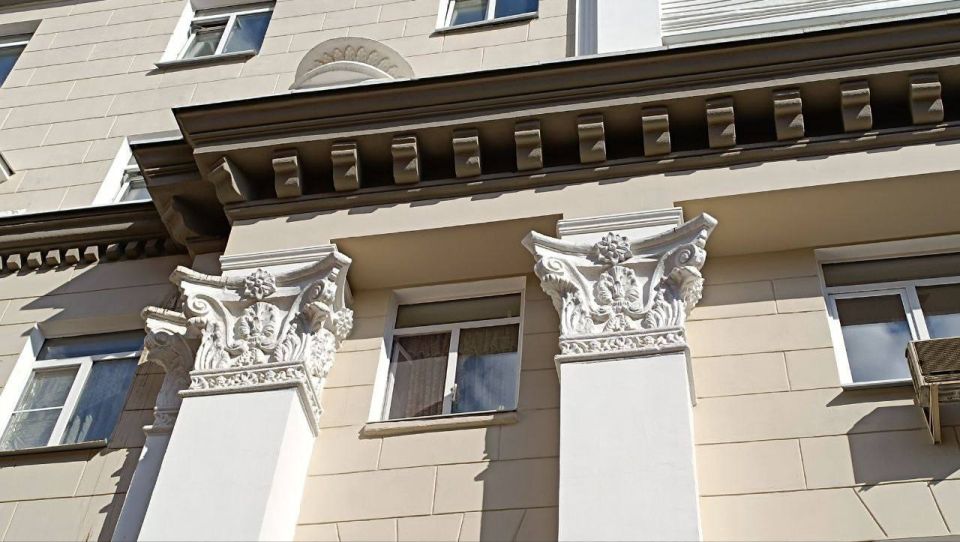 Специалисты из Московской области отремонтировали этот дом. Заменили кровлю, обновили инженерные системы, установили новые окна. В подъездах выполнили отделочные работы. С особой бережностью строители отнеслись к восстановлению фасада, окрасив его в благородные оттенки и выделив белым цветом нарядные колонны и все лепные элементы.