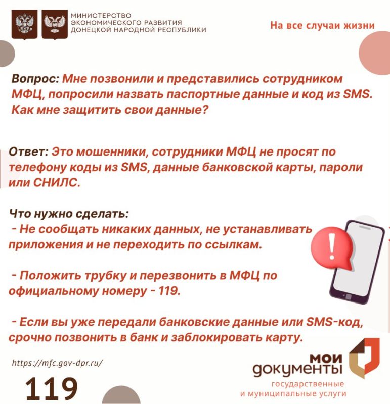 Будьте осторожны и не доверяйте таким звонкам! МФЦ никогда не запрашивает личные данные по телефону