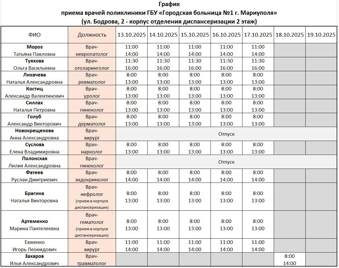 График работы врачей ГБУ "ГБ №1 г. Мариуполя" с 13.10.2025 по 18.10.2025 г.