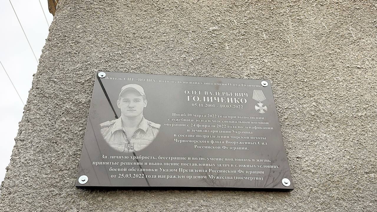 Мемориальную табличку установили в СНТ «Волна» в честь 20-летнего местного жителя Олега Голиченко, погибшего в марте 2022 года в ходе выполнения боевого задания под Мариуполем.