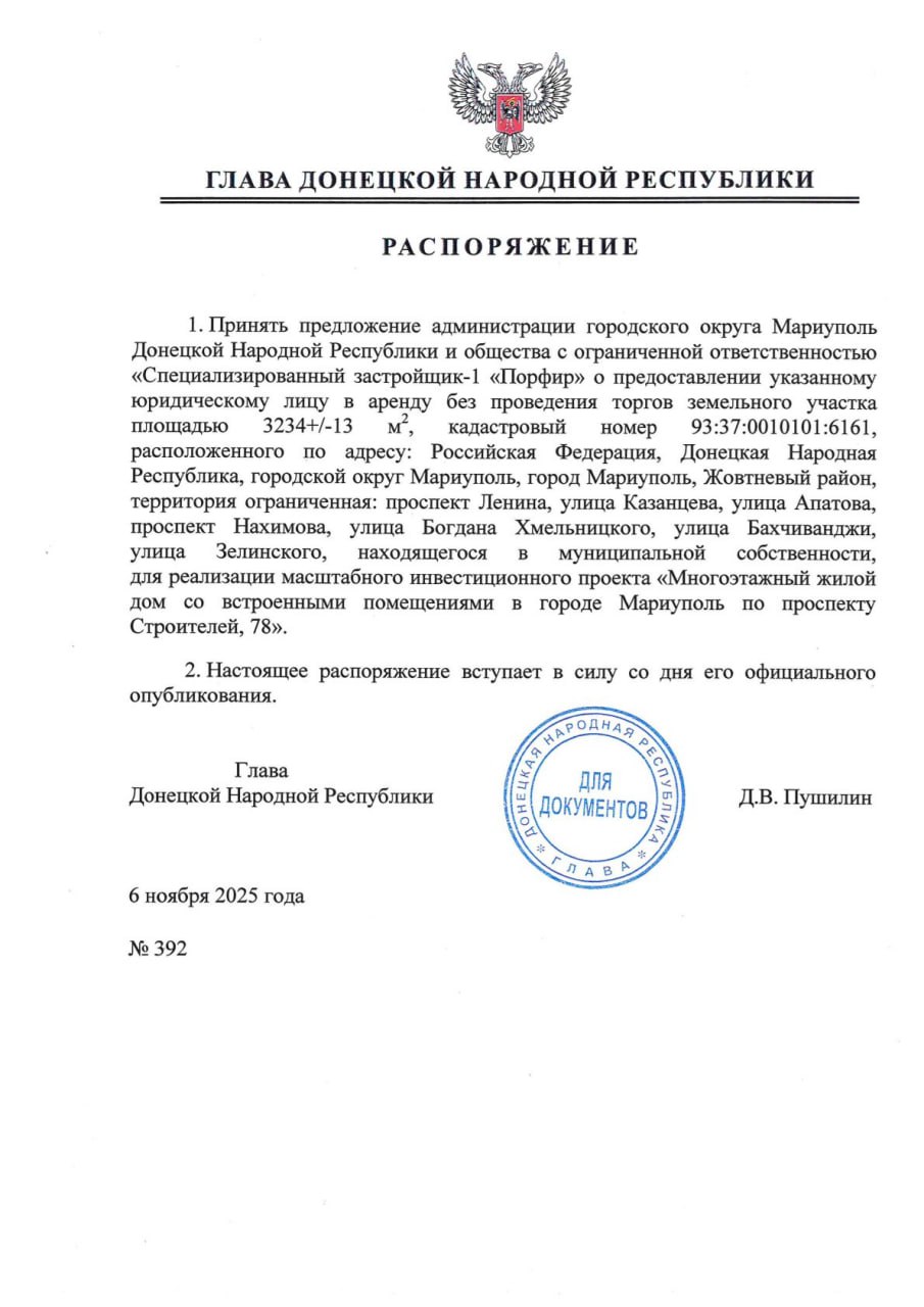 Глава ДНР подписал ряд распоряжений о предоставлении специализированному застройщику в аренду земельных участков в Мариуполе для строительства многоквартирных жилых домов со встроенными помещениями.