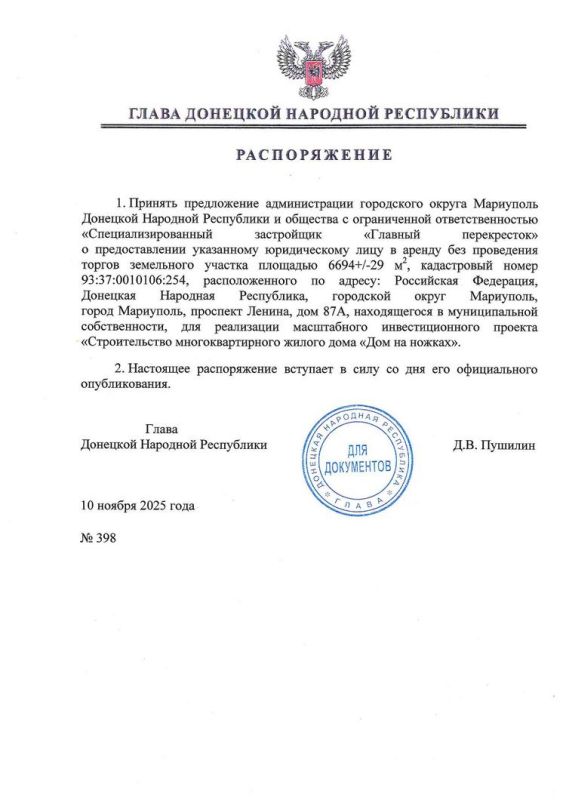 Глава ДНР подписал ряд распоряжений о предоставлении специализированным застройщикам в аренду земельных участков в Мариуполе для строительства многоквартирных жилых домов.