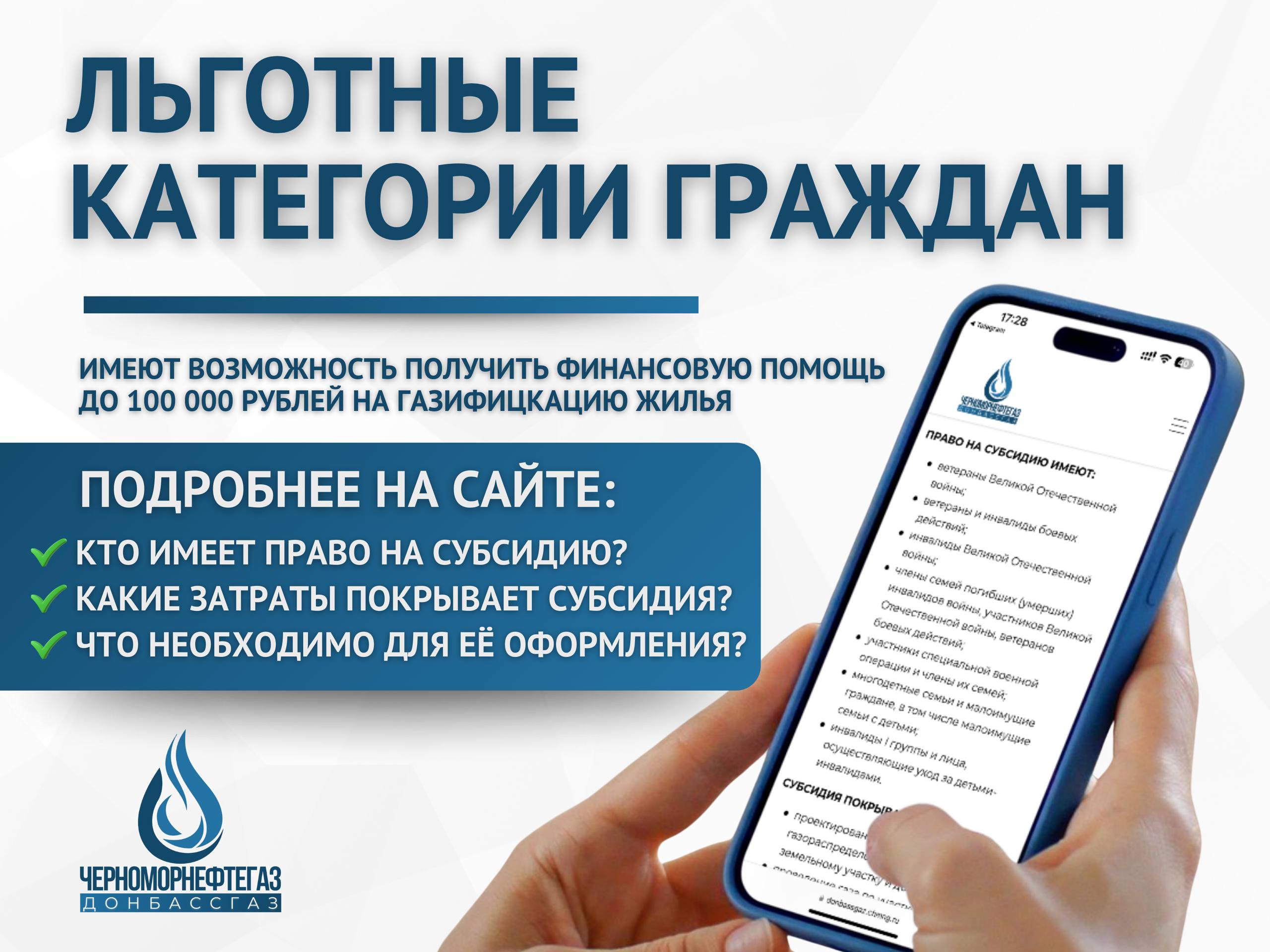 В связи со вступлением в силу Постановления Правительства Донецкой Народной Республики от 30 мая 2025 года № 51-3 «Об утверждении Порядка предоставления субсидий льготным категориям граждан на покупку и установку газоиспользующего оборудования, проведение работ при социальной газификации (догазификации)», льготные категории граждан имеют возможность получить финансовую помощь до 100 тысяч рублей на газификацию жилья.
