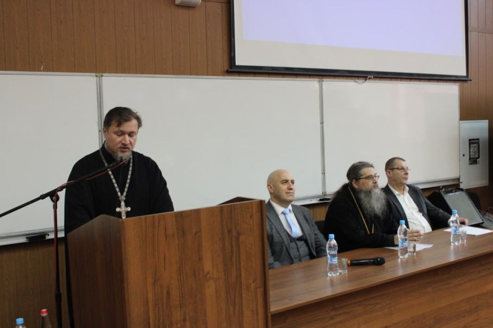 С приветствием к участникам конференции обратился проректор ДонГУ Алексей Игнатов, руководитель Епархиального отдела религиозного образования и катехизации Донецкой епархии Русской Православной Церкви протоирей Дмитрий Чеверда зачитал приветственное слово Высокопреосвященнейшего Владимира Митрополита Донецкого и Мариупольского.