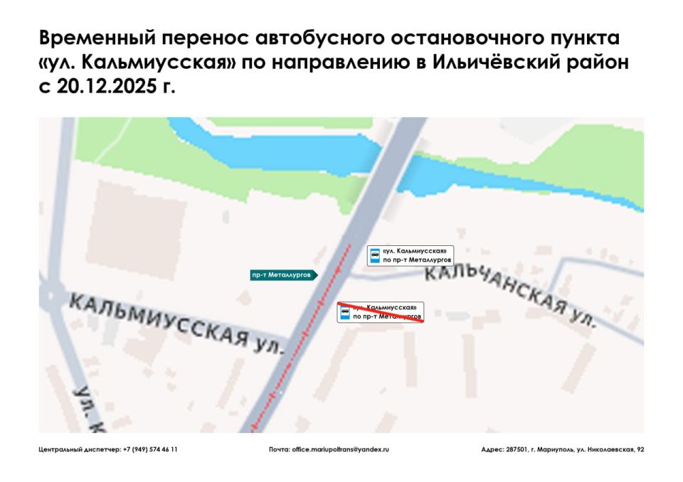 Информируем, что с 20.12.2025 г., автобусный остановочный пункт «ул. Кальмиусская» по направлению в Ильичёвский район временно переносится.