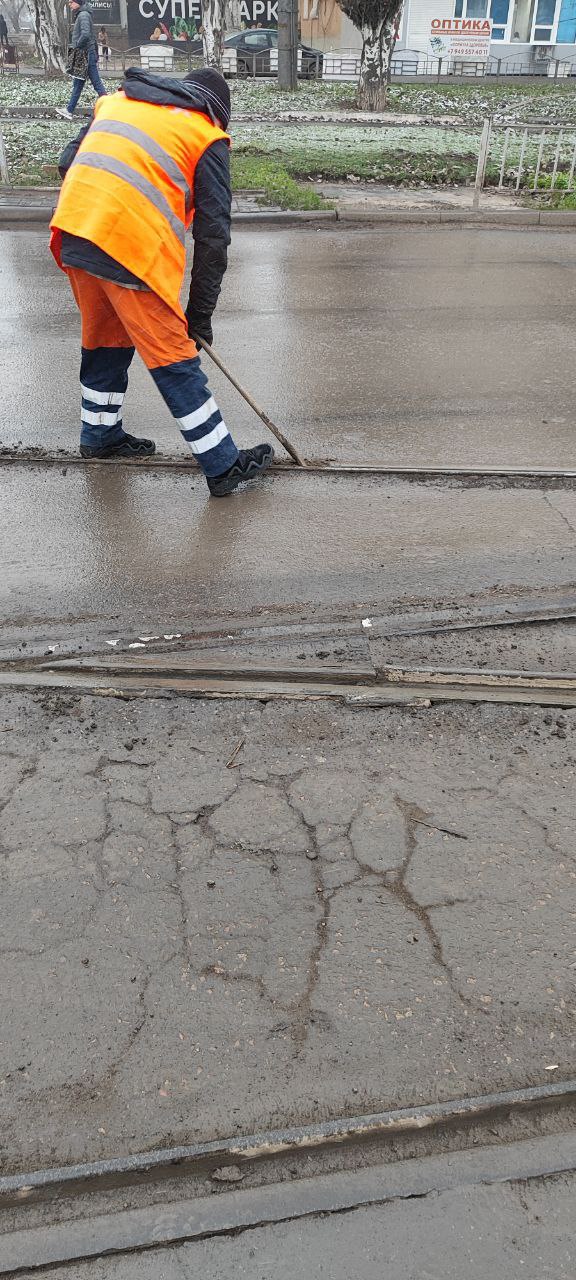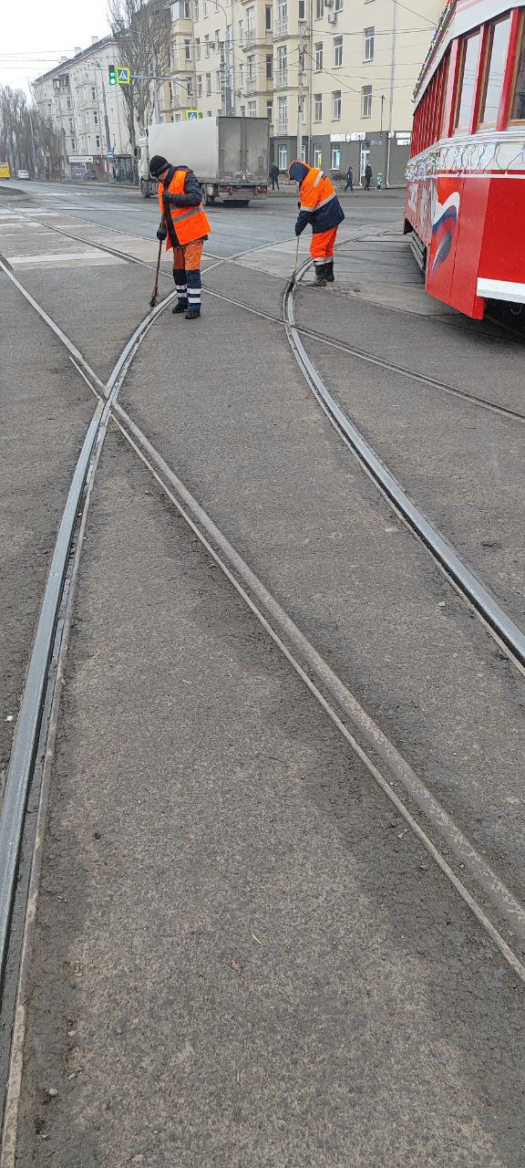 Мариупольтранс: Ежедневно специалисты службы по обслуживанию и ремонту пути МУП « МАРИУПОЛЬТРАНС» производят очистку и обслуживание спецчастей трамвайного пути