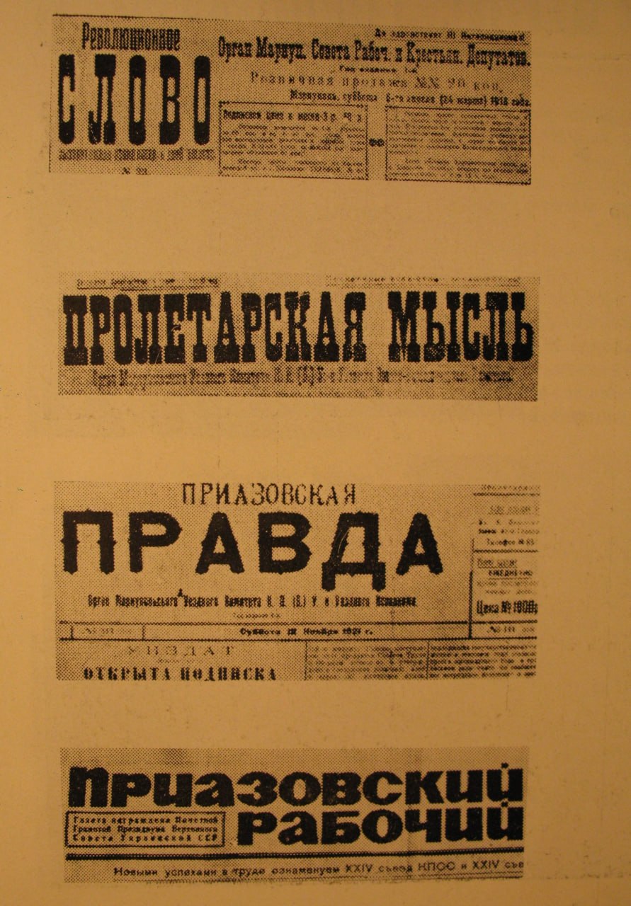 В дополнение к предыдущему сообщению. "Революционное слово", "Пролетарская мысль", "Приазовская правда" и, наконец, "Приазовский рабочий". Так менялось название мариупольской городской газеты. Кстати, эта часть газеты, которая размещается на первой полосе и на которой указано название газеты и номер выпуска, называется "паспорт".