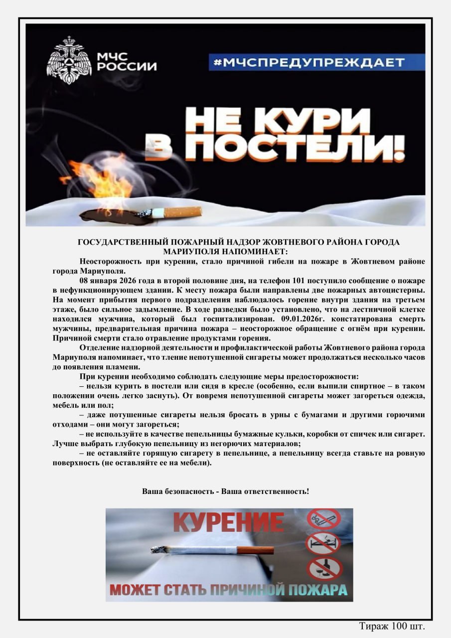 Государственный пожарный надзор напоминает: неосторожное обращение с огнём при курении остаётся одной из главных причин пожаров и трагедий.