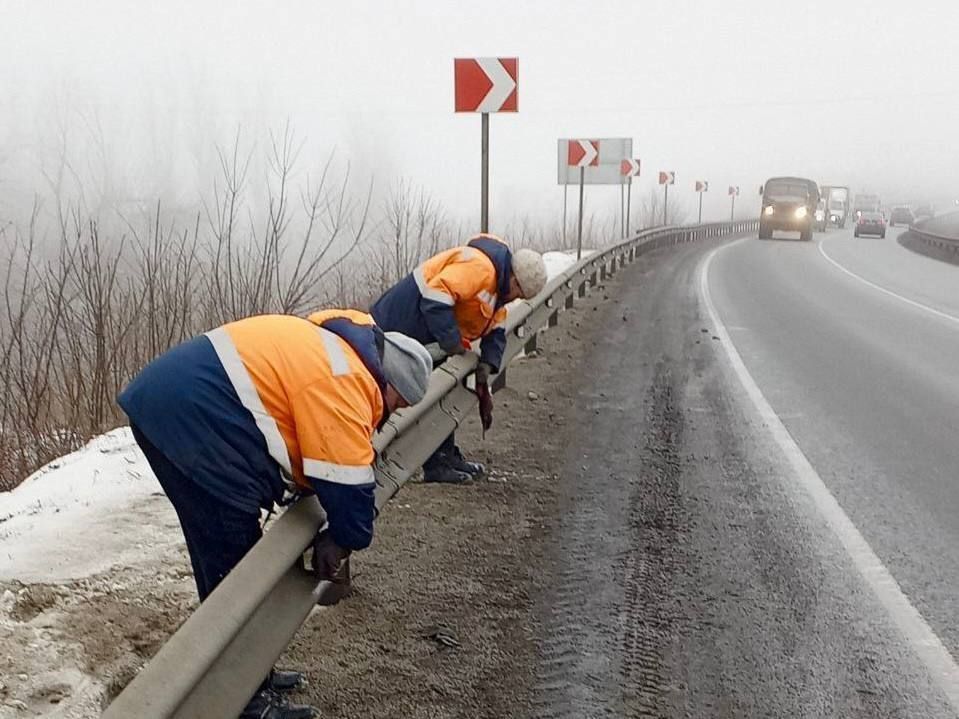 дорожники выполнили очистку светоотражающих элементов на металлическом барьерном ограждении на автодорогах: