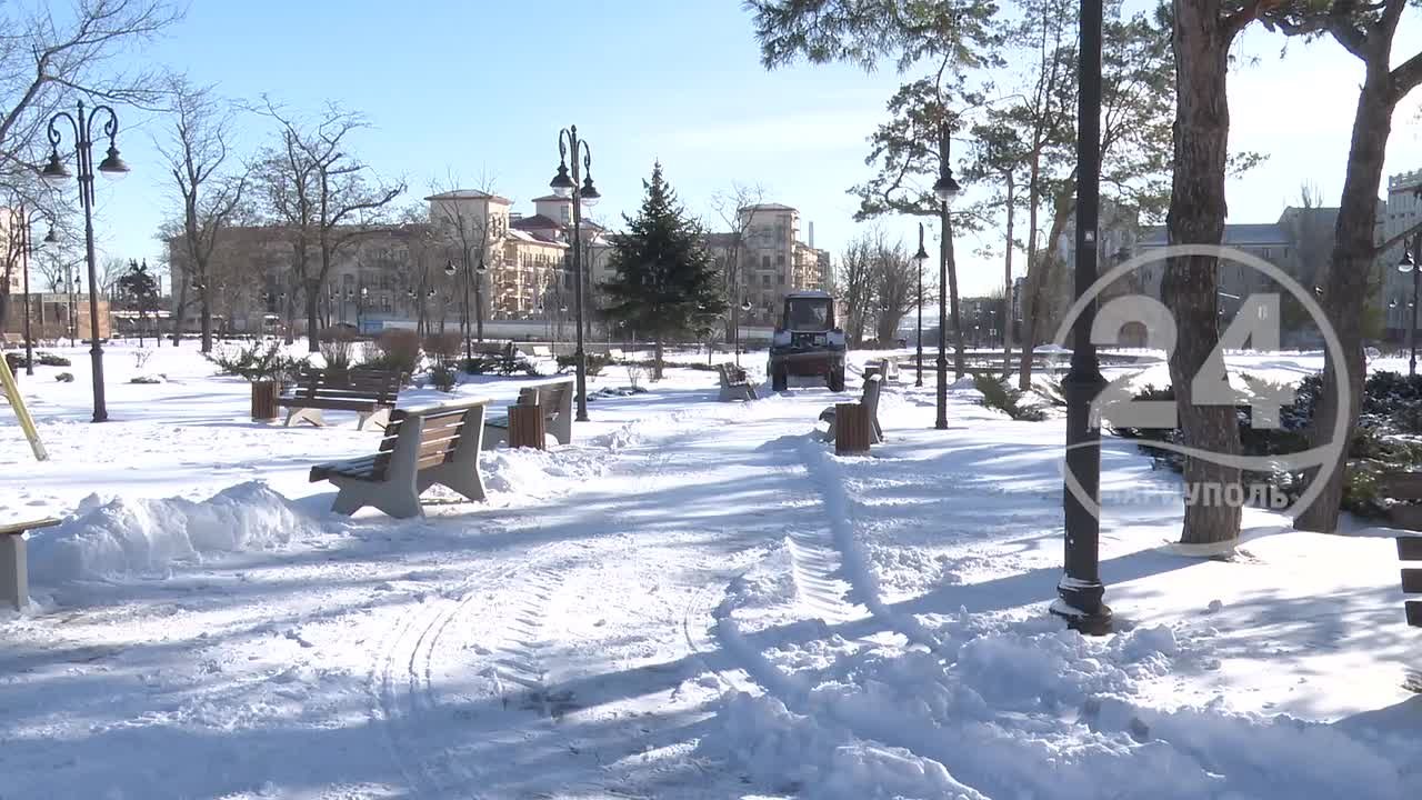 Снегоборьба продолжается. Сотрудники МУП "Зеленстрой" с 5 утра продолжают расчищать снег в общественных местах города.