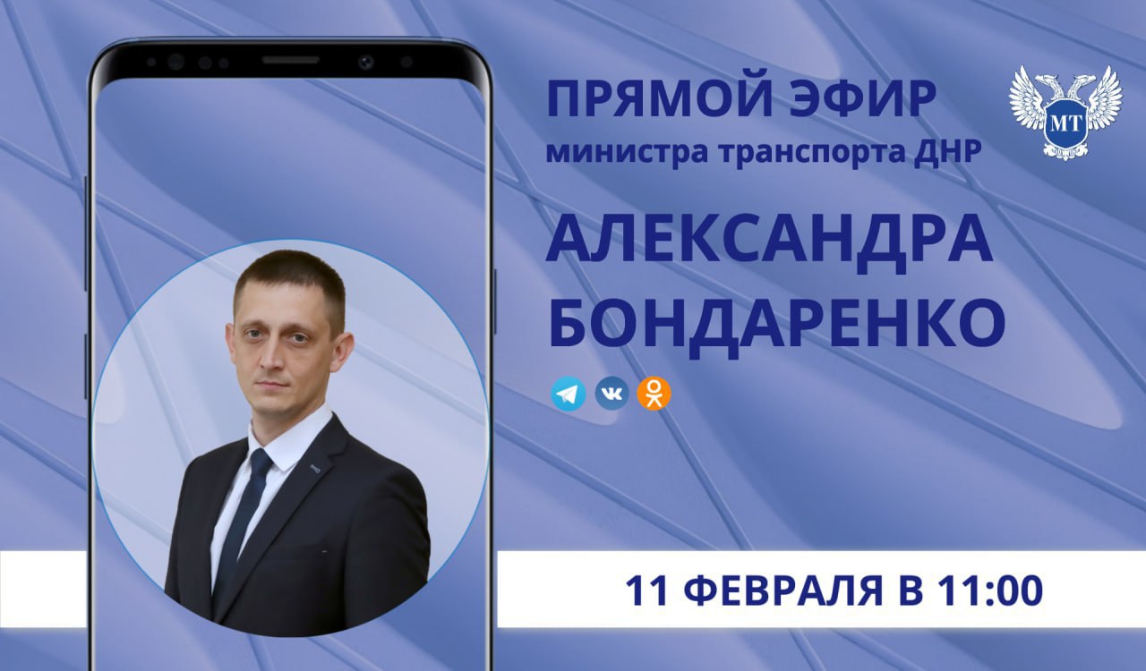 В среду, 11 февраля, в 11:00 министр транспорта ДНР Александр Бондаренко проведет прямой эфир