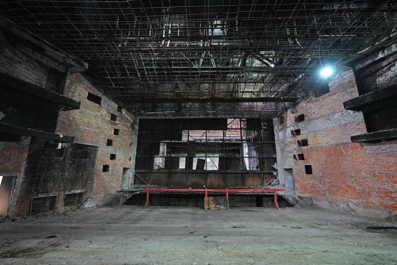 В ДК «Металлургов» уже работает бригада из 34 специалистов, а также используется техника от «Модуль-Центра». Сейчас идет первый, демонтажный этап. Внутренняя часть учреждения культуры похожа на Мариупольский драмтеатр в 2022 году