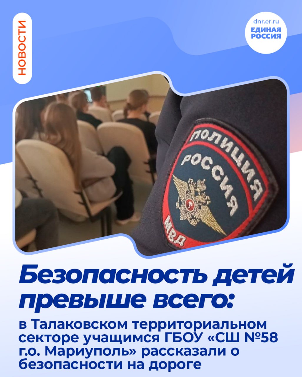 В рамках партийного проекта "Безопасные дороги" в ГБОУ «СШ №58 г.о. Мариуполь» Талаковского территориального сектора прошло профилактическое занятие для учащихся, посвящённое правилам дорожного движения и безопасному поведению на дорогах.