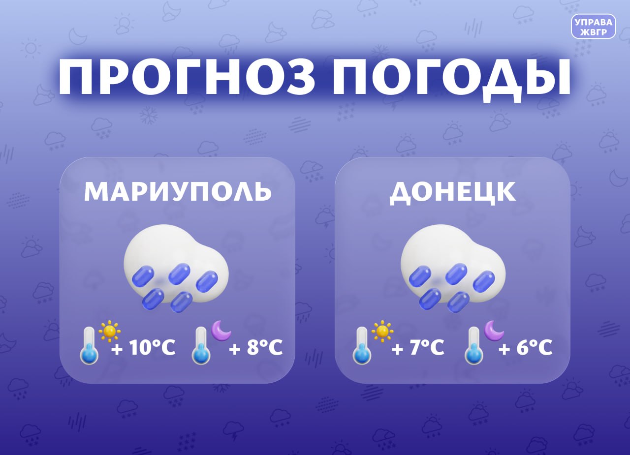МариупольНа протяжении дня ожидается дождь.Днем температура составит +10°C, ночью составит до +8°C.ДНРНа протяжении дня ожидается дождь.Днем температура составит +7°C, ночью понизится до +6°C.ВК MAX